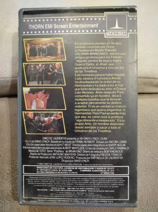 Cinta VHS con la película de 1984, Dune. Dirigida por David Lynch, ésta película de culto cuenta en el reparto con nombres como, Sting, Sean Young, o Kyle McLachlan, entre otros. Primera edición española procedente de video club.