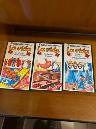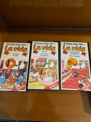 Conjunto de tres cintas VHS de la serie Érase una vez... La vida. - La vista y el oído - La piel, la boca y los dientes - Los huesos y el esqueleto y los músculos - y muchos mas - Cada cinta contiene 2 episodios completos. Cada una son 5 euros