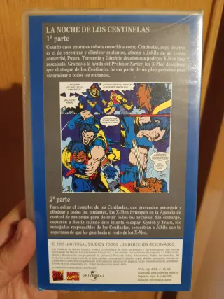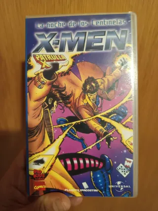 Película VHS de X-Men. ESCUCHO OFERTAS - Título: La Noche de los Centinelas. - Incluye el logo de Fox Kids Video y Marvel Comics. - Distribuido por Planeta DeAgostini y Universal.