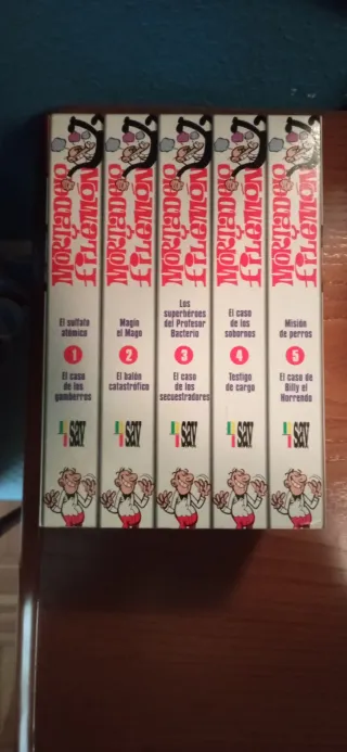 Conjunto de cinco cintas VHS de Mortadelo y Filemón. Alguna cinta habría que limpiarla porque llevaban años guardadas, pero la caja perfecta, las dejo baratas para algún coleccionista de cintas de dibujos animados y comics que sepa limpiar VHS o las quiera como decoración porque el cartón está en un estado impresionante para tener más de 20 años - El sulfato atómico / El caso de las gamberros - Magín el Mago / El balón catastrófico - Los superhéroes del Profesor Bacterio / El caso de los secuestradores - El caso de los sobernos / Testigo de cargo - Misión de perros / El caso de Billy el Horrendo