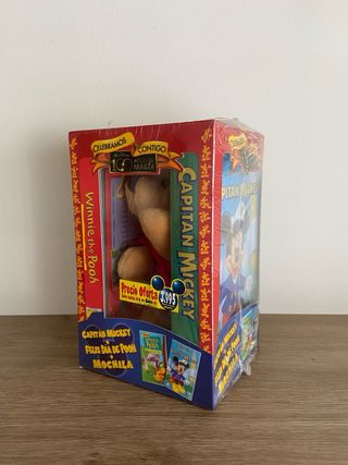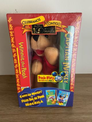 Caja de colección de Winnie the Pooh y Capitán Mickey, precintado de fábrica. Articulo de colección, muy raro. Incluye las peliculas en VHS de Mickey Mouse y Winnie the Pooh en una caja de coleccionista con un peluche. Pegatinas originales en pesetas.