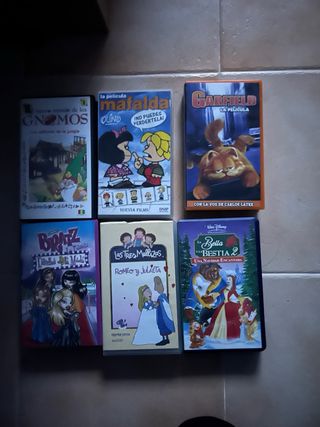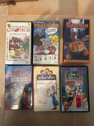 Se vende lote o individual películas VHS de animación. - El nuevo mundo de los Gnomos - Mafalda: Ino puedes perdértela! - Garfield: La Película - Bratz: Estrellas de la Moda - Las Tres Mellizas: Romeo y Julieta - La Bella y la Bestia 2: Una Navidad Encantada -La abeja Maya -El rey León II -Pinocho -Peter Pan precio negociable