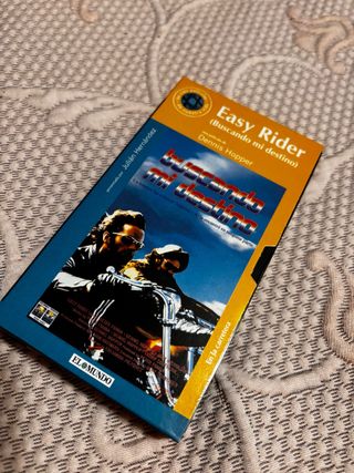 Película clásica Easy Rider en formato VHS, con el título en español Buscando mi destino. - Presentada por Julián Hernández. - Dirigida por Dennis Hopper. - Incluye la carátula original.