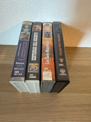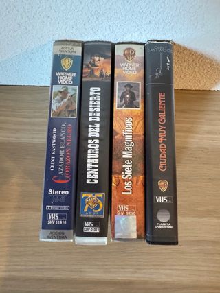 Se venden cuatro cintas VHS de películas del Oeste. Están en buen estado y son perfectas para coleccionistas. - Incluyen las películas: Centauros del Desierto, Los Siete Magníficos, Ciudad Muy Caliente y Cazador Blanco, Corazón Negro. - Formato VHS. - Idioma español.