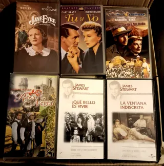 Lote de 6 películas clásicas en formato VHS. - Jane Eyre (Orson Welles, Joan Fontaine) - Tu y Yo (Cary Grant, Deborah Kerr) - Las Minas del Rey Salomón (Stewart Granger, Deborah Kerr) - La Rosa Negra (Tyrone Power) - ¡Qué Bello es Vivir! (VENDIDA) - La Ventana Indiscreta (James Stewart, Grace Kelly) - El solterón y la menor (Cary Grant)