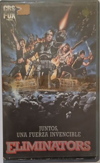 Cinta VHS de la película Eliminators. ¡Una fuerza invencible!. La cinta aparenta estar en buen estado, aunque puede tener algunas señales de uso. - Incluye la película Eliminators en formato VHS. - Idioma: Español. - Género: Acción y ciencia ficción.