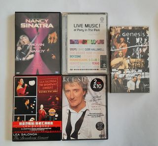 -Nancy Sinatra "Movin with Nancy"Dvd Rareza edición Corea del Sur 2.004 (6€) -Live Music ! at Party in the Park 99 (Vendido) -Lea Salonga "The broadway Concert"Dvd (5€) Rareza edición China 2.004,incluye póster desplegable. Cómo nuevo,impecable. -Rod Stewart "It had to be you..the great american songbook"Dvd (4€) -Genesis "A history"VHS (5€) Audio Inglés, Edición Española 1993 documental Todos los Dvd's se reproducen sin problema ninguno. Mira mi perfil si te interesa algo puedo hacer un lote, hago precio.