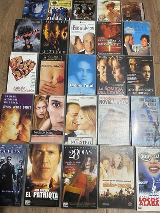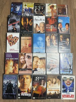 Colección de 20 películas en formato VHS. Incluye una variedad de géneros y títulos. - Deep Blue Sea - El Sexto Sentido - El Padre de la Novia - Misión a Marte - Dave, Presidente por un día - American Beauty - Ojos bien cerrados - Inocencia Interrumpida - Historia de nuestro - Matrix - El Patriota - 28 Días - Música en el Corazón - Locos en Alabama - Snatch - Erin Brockovich - Calma Total - La Sombra del Diablo - El Coleccionista de Huesos - Kim Basinger es Extremadamente Peligrosa