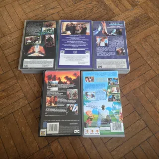 8 Películas de VHS: Peter Pan, Pulgarcita, Titanic, La Bella Durmiente, Dragon Heart, Aladdín, Blancanieves y Rugrats, más una para aprender inglés. Se ven todas perfectamente y funcionan, alguna tiene los papeles de las carátulas un poco deterioradas.