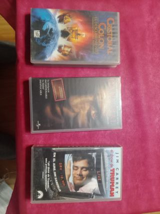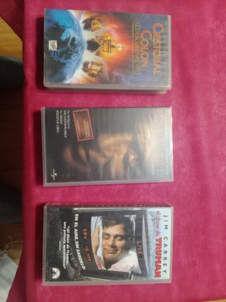 Conjunto de tres cintas de video VHS. - Cristóbal Colón: El Descubrimiento - El Show de Truman (una vida en directo) - Película adicional sin título visible en la imagen.