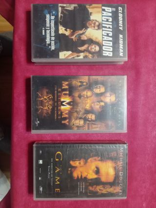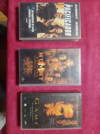 Colección de tres películas en formato VHS. - El Pacificador (The Peacemaker) con George Clooney y Nicole Kidman. - La Momia: El Regreso (The Mummy Returns) con Brendan Fraser. - The Game con Michael Douglas, dirigida por David Fincher.