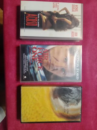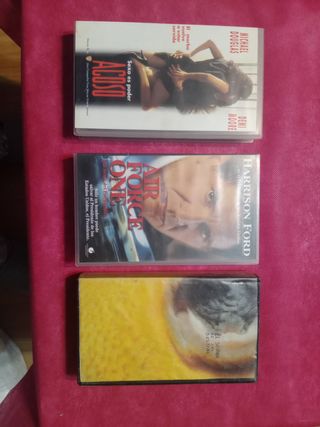 Conjunto de tres cintas de video VHS con películas. - Acoso (1994) con Michael Douglas y Demi Moore. - Air Force One (1997) con Harrison Ford. - El Señor de las Bestias (1982).