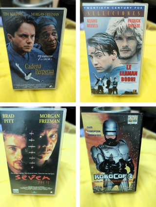 📦 Qué incluye Cinta VHS Bodhi (Fox), cinta VHS Seven (Columbia Tristar), cinta VHS RoboCop (Columbia Tristar), cinta VHS Cadena Perpetua (Castle Rock), caja plástica, carátula original, artículo para coleccionistas de cine noventero, fans de Keanu Reeves, RoboCop, David Fincher y Stephen King, videoclub retro o decoración. ⚠️ Estado Todas probadas y funcionando. 🚚 Condiciones de venta No hago envíos.
