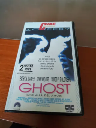 Película Ghost en formato VHS, protagonizada por Patrick Swayze, Demi Moore y Whoopi Goldberg. - Ganadora de 2 Oscars en 1991. - Incluye el título en español Más allá del amor. Se ve en buen estado, pero,sin probar no tengo VHS