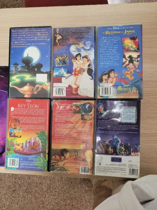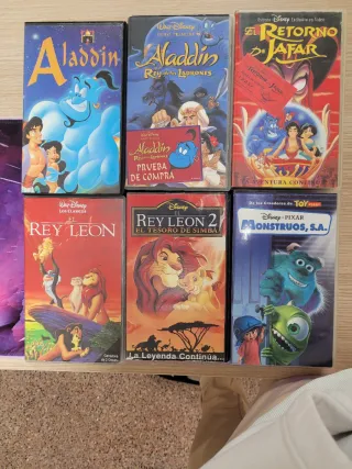 Colección de 6 películas VHS de Disney. - Aladdin - Aladdin y el Rey de los Ladrones - El Retorno de Jafar - El Rey León - El Rey León 2: El Tesoro de Simba - Monstruos S.A. Se escuchan ofertas