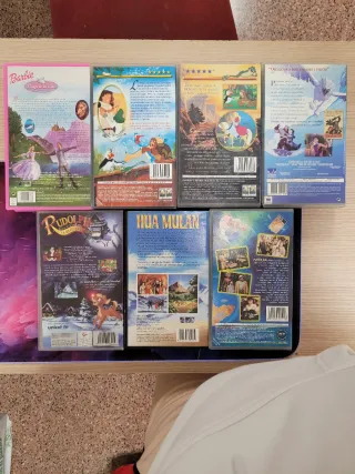 Colección de 7 películas VHS de dibujos animados en español. - Barbie: El lago de los cisnes - La Princesa Cisne III: El misterio de la reina encantada - La Princesa Cisne - Simbad: La leyenda de los siete mares - Rudolph, la película - Hua Mulan - Matilda Se escuchan ofertas