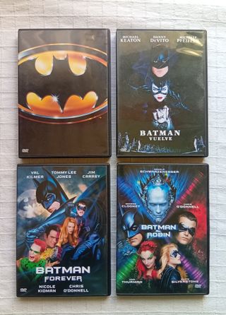 Lote completo de la saga clásica de Batman (1989-1997) en DVD. Incluye las cuatro películas icónicas: "Batman" y "Batman Vuelve" (Tim Burton), y "Batman Forever" con "Batman & Robin" (Joel Schumacher). Ediciones originales de Warner Bros (Z4) con audio y subtítulos en castellano. Discos y cajas en muy buen estado de conservación. Ideal para coleccionistas de cine de superhéroes o nostálgicos de los 90. Disfruta de las actuaciones de Michael Keaton, Jack Nicholson, Michelle Pfeiffer, Jim Carrey y Arnold Schwarzenegger en su formato físico original. #Batman #DC #Cine #DVD #Coleccionismo #Películas #TimBurton #Superheroes #LoteDVD #