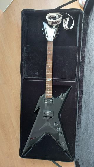 Guitarra eléctrica Dean Razor con un acabado negro brillante en forma de rayo. Incluye funda acolchada - Cuerpo de madera. - Mástil de madera. - Diapasón con incrustaciones. - Pastillas dobles. - Puente fijo. - Clavijero metálico.