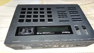 Caja de ritmos Roland R-8 Human Rhythm Composer. Es un instrumento musical electrónico diseñado para componer, programar y reproducir patrones rítmicos. Destaca por su función "human feel", que ajusta la micro-sincronización y la velocidad para emular un toque más orgánico y real. Cuenta con una pantalla LCD, pads sensibles al tacto, y diversas funciones de edición de sonido como tono y decaimiento. Es considerada una pieza clásica y muy codiciada en el coleccionismo de equipos de música electrónicos.
