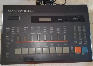 Caja de ritmos digital Kawai R-100 lanzada en 1987. Tecnología: Utiliza muestras digitales de 12 bits a una frecuencia de muestreo de 32 kHz para un sonido característico de la época. Características: Cuenta con 8 pads sensibles a la velocidad y polifonía de 8 voces. Conectividad: Incluye MIDI In/Out/Thru, sincronización DIN, 8 salidas individuales y una salida estéreo. Sonido: Ofrece 24 sonidos de batería y percusión integrados.