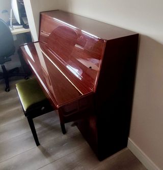 Piano acústico de madera, ideal para practicar o para decorar tu hogar. Se encuentra en buen estado. - Acabado en madera de cerezo. - Incluye banqueta a juego.