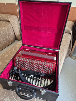 Acordeón rojo en excelentes condiciones estéticas. Ideal para principiantes o coleccionistas. - Color rojo con vetas. - Diseño clásico. - Incluye funda.