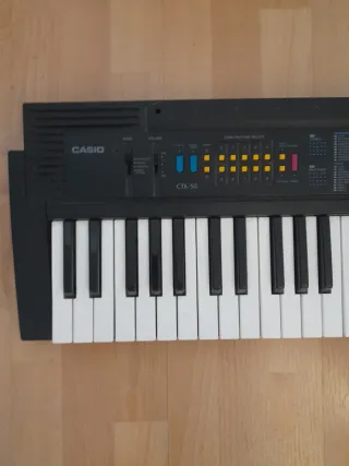 Teclado electrónico Casio CTK-50. - Teclas blancas y negras. - Panel de control con botones y diales. Funciona con 6 pilas 1.5V LR6 y cargador 9 V.