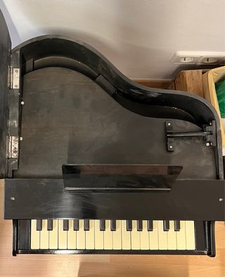 Mini piano de cola infantil Keller Do-Re-Mi Mini piano de cola infantil del siglo XX Auténtico mini piano acústico con cuerdas (varillas) de percusión Dispone de teclado ampliado de tres octavas completas con sostenidos y bemoles Teclado con 41 teclas, 24 blancas y 17 negras (los pianos infantiles suelen tener 37 teclas) Funciona perfectamente, tan solo tiene las bisagras de la tapa sueltas, algo fácilmente reparable. Medidas: Ancho: 72 cm. Largo (cola): 67 cm. Alto: 68 cm. Peso aproximado: 10 Kg.
