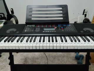 Teclado digital de 61 teclas de la marca Bontempi, modelo La Voz. - Reproducción de canciones MP3 desde USB. - 60 canciones. - 40 sonidos. - 100 ritmos. - Pantalla digital. - Funciones Sustain, Vibrato y Echo. - Transpositor. - Grabación y reproducción. - Adaptador incluido. Tiene roto el soporte de las partituras.