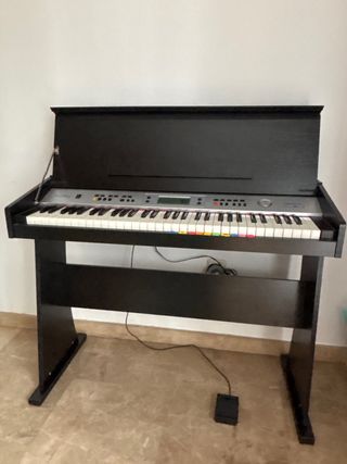 Teclado con 61 teclas que funciona con pilas o con alimentación por cable. Pantalla táctil LCD, función de aprendizaje. Incluye asiento acolchado y pedal. Usado solo unos días. En Amazon cuesta 150€