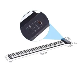 Piano electrónico portátil con diseño enrollable. Ideal para practicar en cualquier lugar. - Teclado de 61 teclas. - Pantalla digital. - Conexión para auriculares. - Puerto USB.
