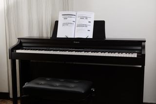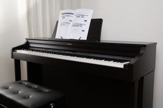 Piano digital Roland en color negro, ideal para practicar y disfrutar de la música. Incluye banqueta a juego. - Teclado de 88 teclas contrapesadas. - Diseño elegante y moderno. - Soporte para partituras integrado. - Banqueta acolchada con patas robustas.