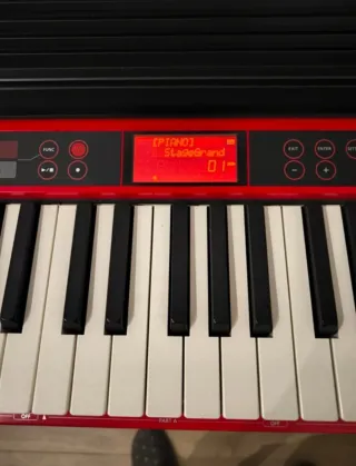 Teclado Roland GO:KEYS con 61 teclas sensibles al tacto, ideal para principiantes o músicos profesionales. Se vende por falta de uso. Incluye funda. Venta presencial en Madrid capital o Toledo ciudad. - 5 octavas de teclado. - Diseño compacto y ligero. - Color rojo vibrante. - Gran variedad de sonidos y ritmos. - Función Loop Mix para crear música. - Conexión Bluetooth para dispositivos móviles.