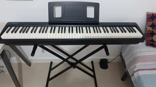 Piano digital Roland Go Pino 88 de 88 teclas con soporte en X Rock Jam Xfinity - Teclado sensible al tacto de 88 teclas. - Diseño compacto y ligero. - Conexión Bluetooth - Incluye atril para partituras. - No incluye pedal porque lo perdí en una mudanza, pero se le puede añadir un pedal (valen unos 12-15 euros) Ideal para comenzar a tocar el piano. También puede usarse como teclado midi. Está como nuevo, se ha usado muy muy poco, ya que lo compré para poder practicar durante unos meses que tuve que mudarme por trabajo y al volver a casa no lo he vuelto a utilizar. Lo entrego en su caja original. También tengo una funda de tela,