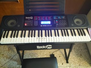 Teclado electrónico Rockjam con soporte ajustable y banqueta. - Teclado de 61 teclas. - Soporte metálico plegable. - Banqueta acolchada. - Pedal de sustain incluido. Comprado hace 1 año por navidades, sin prácticamente usarlo. Esta nuevo y con su caja.