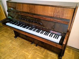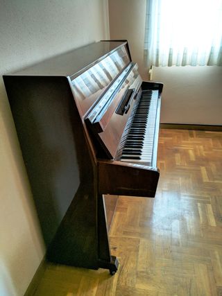 Piano vertical de madera con un diseño clásico. Es antiguo, tiene problemas de afinación, pero su sonido gusta a mucha gente.