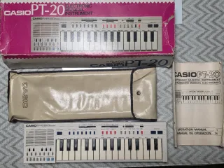 Teclado electrónico musical Casio PT-20. Vintage (años 80). Funciona perfectamente. Se aceptan ofertas (serias) - Incluye funda original (le falta parte del remache, pero fácil de colocar) - Incluye manual de operación. -Incluye caja original (en mal estado)