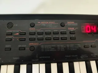 Teclado musical Yamaha en buen estado, ideal para aprender. - Incluye adaptador de corriente. - Teclas blancas y negras. - Panel de control con botones y pantalla digital.