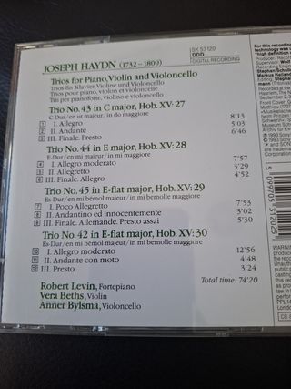 Este CD de música clásica presenta The Last 4 Piano Trios de Joseph Haydn. - Interpretado por Robert Levin y Vera Beths. - Incluye la participación de Anner Bylsma. Caja ligeramente rayada ángulo inferior derecho( última foto). Resto perfecto. Disco sin uso