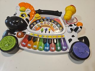 Piano musical infantil VTech en buen estado. Es un juguete educativo con luces y sonidos. - Tiene forma de cebra. - Incluye un micrófono. - Presenta botones con notas musicales y animales. - Ideal para que los más pequeños aprendan música.