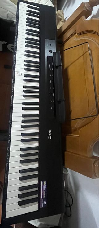 Piano digital RockJam con 88 teclas + soporte( le falta un tornillo) Características: - Marca: RockJam - Modelo: 88 Key Digital Piano - Teclado de tamaño completo con 88 teclas semi-pesadas y sensibles a la velocidad. - 10 voces/timbres únicos, incluyendo piano vertical, piano eléctrico, piano de cola, cuerdas, sintetizador, bajo, guitarra, percusión, órgano Hammond y órgano de iglesia. - 10 demos y canciones para practicar. - Modos de sonido: chorus, reverb y layer para efectos ricos. - Funciones de enseñanza: modo lección y metrónomo para aprender y practicar.