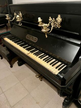 Se regala pisno vertical de estilo antiguo en color negro. Presenta un diseño clásico con detalles ornamentales. - Incluye candelabros dorados con portavelas. - Teclas de marfil y ébano. - Ideal para coleccionistas o como pieza decorativa. Se regala con la condición de que el comprador se encargue del transporte