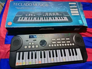 Organo electrónico infantil en su caja de la marca Sheffield. Ideal para iniciarse en la música. Potente y bonito, con los tonos ritmos y lecciones que se ve en la foto, además pueden sonar varias teclas a la vez lo que permite hacer acordes. Solo con pilas. En su caja. - Teclado con 37 teclas. - Altavoces integrados. - Pantalla digital. - Botones de control de tempo y volumen.