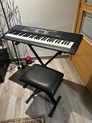 Teclado eléctrico, marca Yamaha y modelo PSR-E253 muy nuevo. Usado muy pocas veces. También vendo por separado la funda acolchada para guardarlo y las patas metálicas de soporte para utilizarlo.