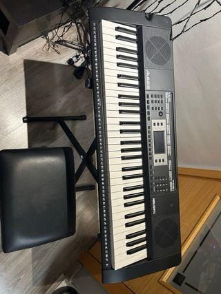 Teclado electrónico Alesis con soporte plegable y banqueta. - Teclado de 61 teclas. - Pantalla LCD. - Soporte metálico. - Banqueta acolchada.
