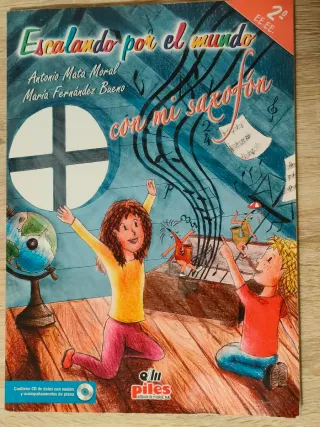 Libro de música Escalando por el mundo con mi saxofón curso 2. - Incluye CD con audios y acompañamientos de piano. - Autores: Antonio Mata Moral y María Fernández Bueno. - Editorial Piles. Tiene sólo algunas marcas a lápiz rodeando el número de página y las puntas algo dobladas de ir en la mochila (ver fotos)