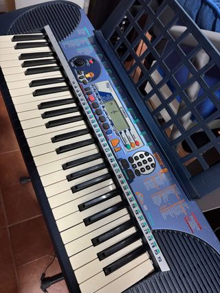 Teclado electrónico Yamaha PSR-140 con soporte para partituras. - Diseño en color azul. - Pantalla LCD. - Panel de control con botones y diales.