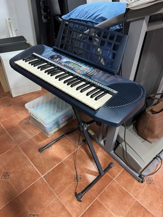 Teclado portátil Yamaha PSR-E403 en buen estado, listo para hacer música. Incluye el soporte. - Teclado de 61 teclas sensibles. - Altavoces integrados. - Puerto USB. - Entrada de auriculares. - Incluye adaptador de corriente.