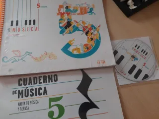 Conjunto de libro y cuaderno de música de 5 de Primaria. Esta escrito a lápiz algunas hojas Libro isbn 9788414007372 Cuaderno Isbn 9788414007389 - Libro de música con diseño de piano y figuras musicales. - Cuaderno de música con pentagrama y clave de sol.