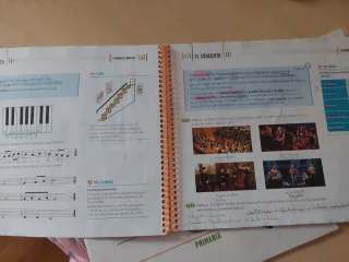 Conjunto de libro y cuaderno de música de 6º de Primaria. Esta escrito a lápiz algunas hojas Libro isbn 9788414007402 Cuaderno Isbn 9788414007419 - Libro de música con diseño de piano y figuras musicales. - Cuaderno de música con pentagrama y clave de sol.
